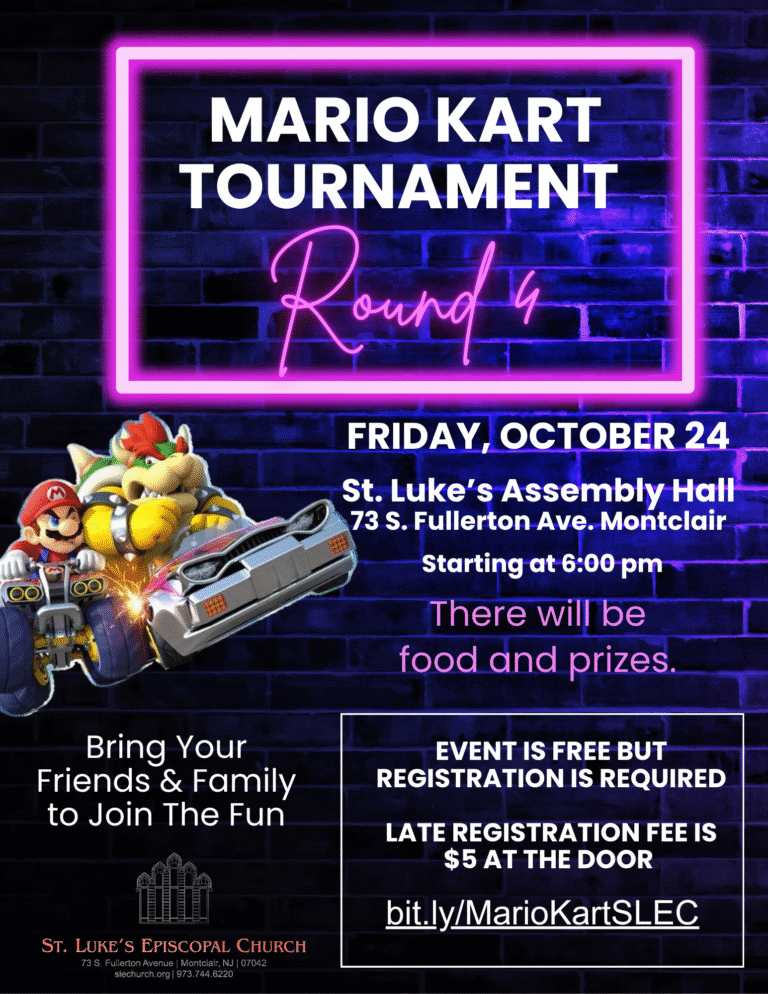 MarioKart Tournament Join us for a MarioKart Tournament! Event Timing: Friday, October 24, 2025 6:00pmEvent Address: St. Luke’s Episcopal Church, 73 S. Fullerton Ave., Montclair, NJFood will be provided and prizes will be awarded!Registration is FREE but required. Latecomers welcome ($5 fee at the door).Contact organizers for any questions. Loading…